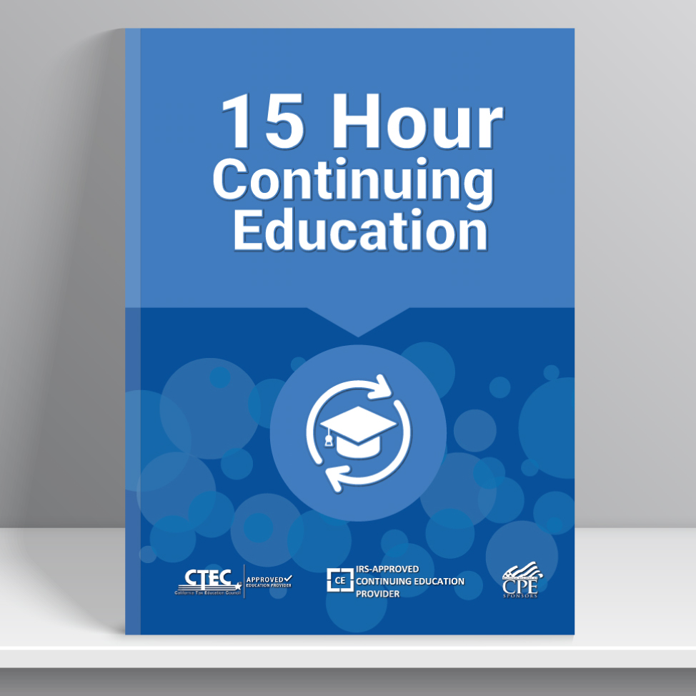 This course gives an intermediate overview of taxable and nontaxable income, business income, depreciation, nonrefundable and refundable tax credits, and an in depth understanding of filing status and exemptions. The course covers adjustment to income, and the difference between standard and itemized deduction. This continuing education course is designed for those individuals who only need 10-hours of tax law, 2 hours ethics and 3-hours of updates.